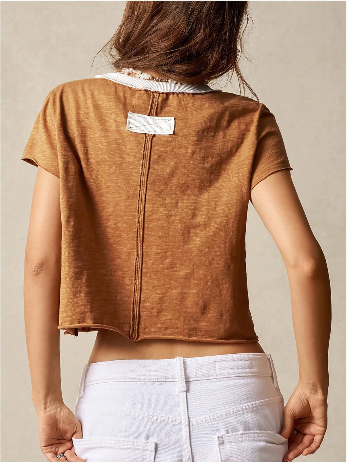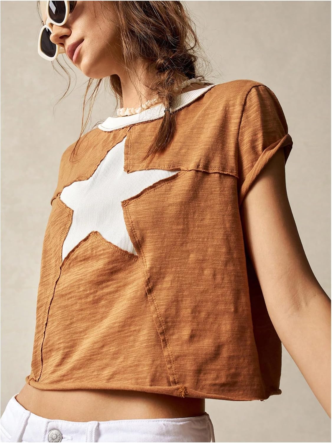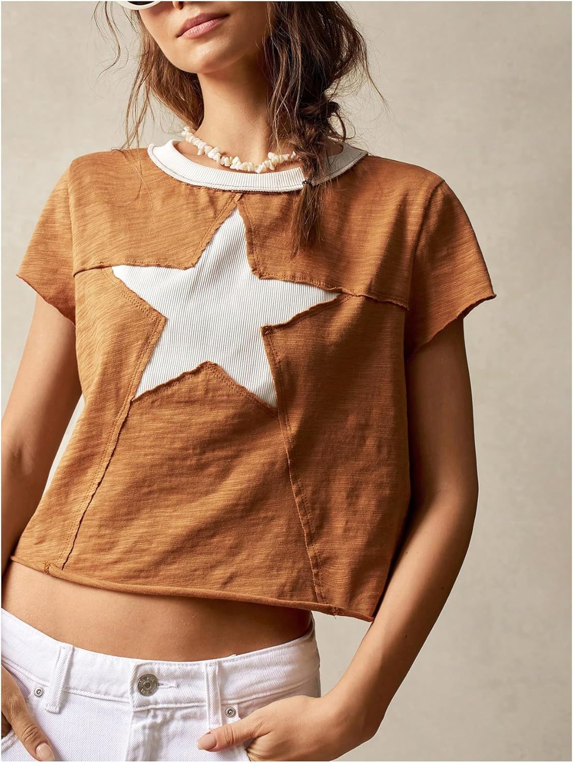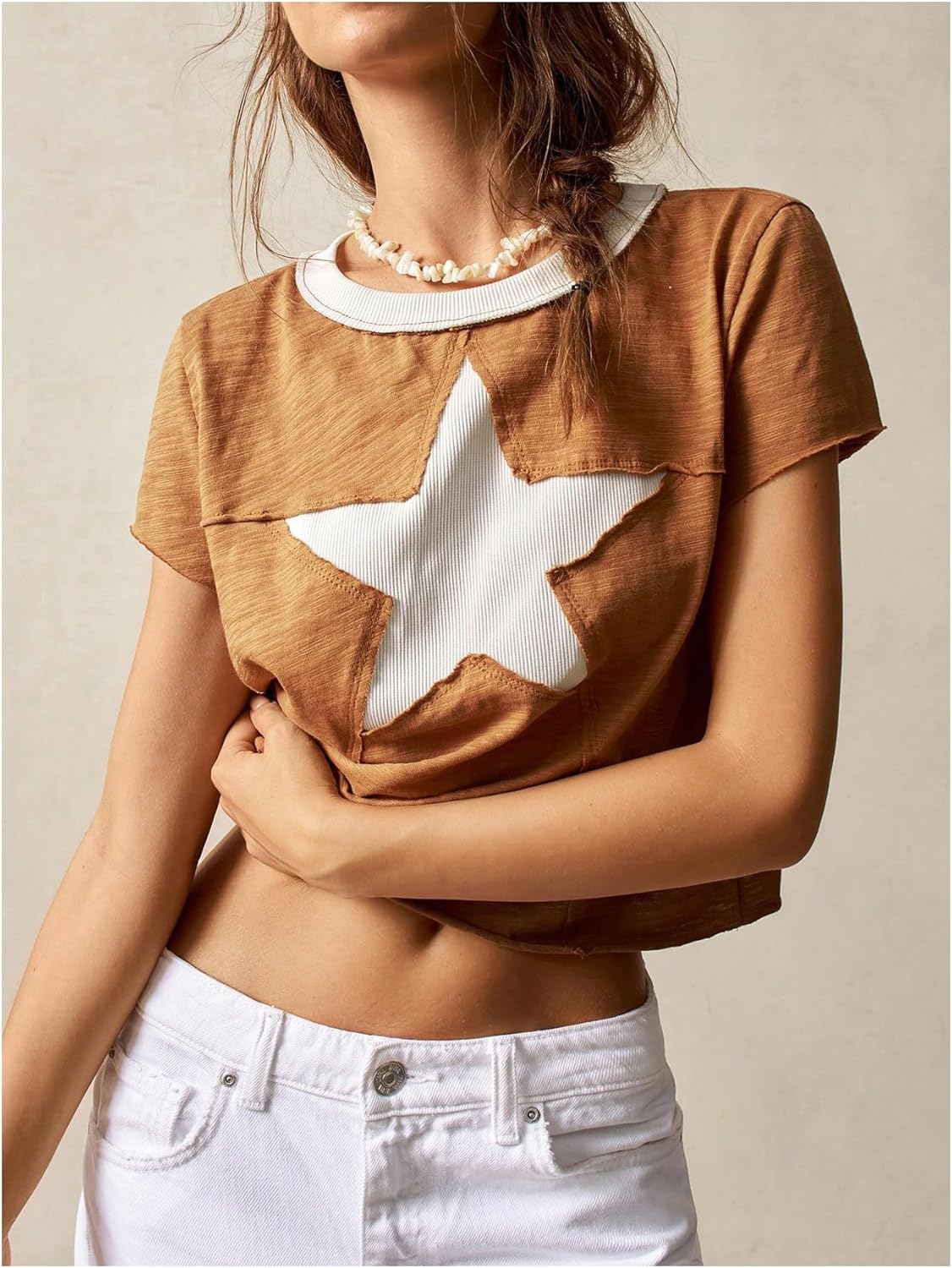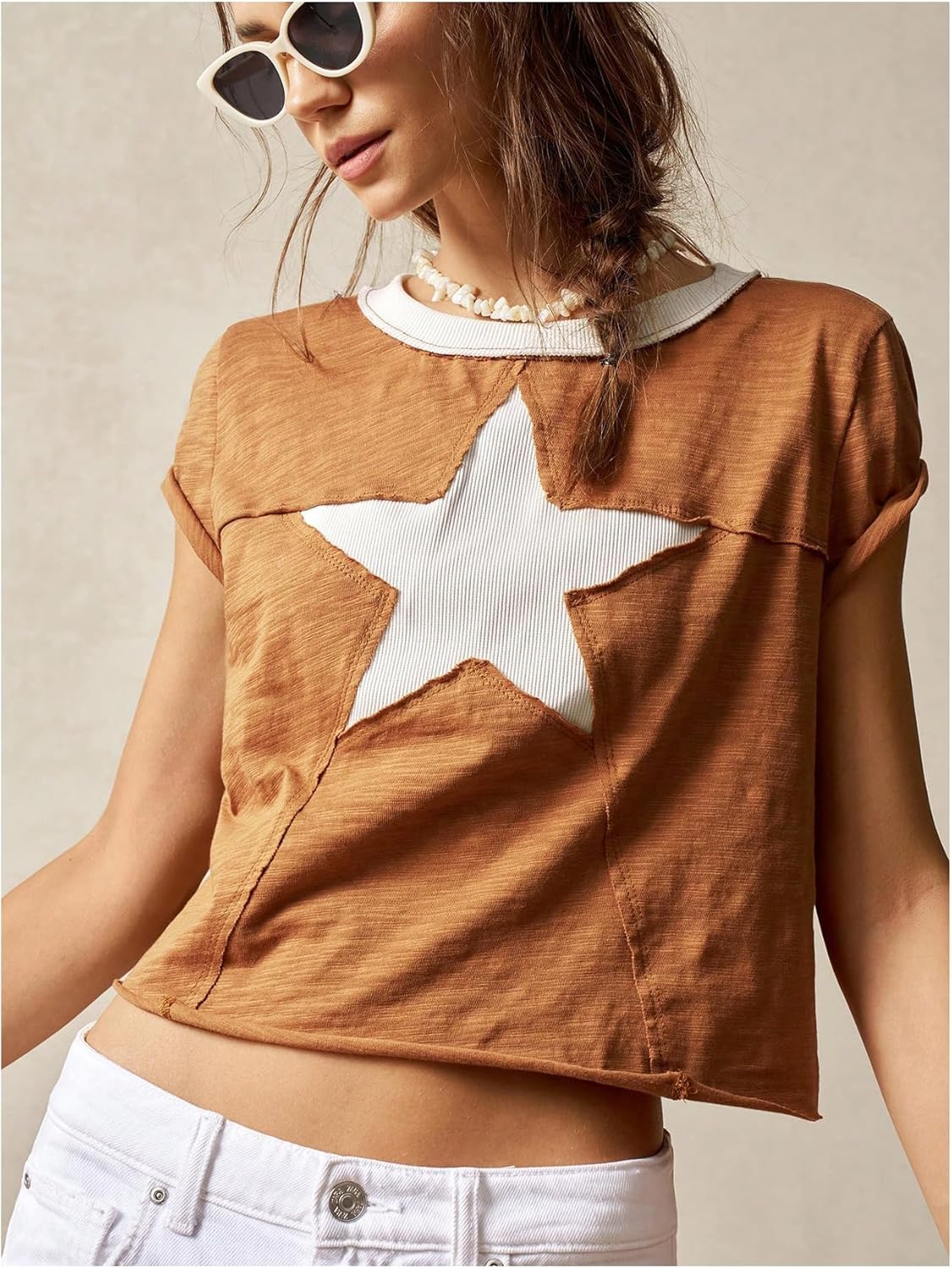 Women’s Star Graphic Color Block Crop Top Crew Neck Short Sleeve T Shirt